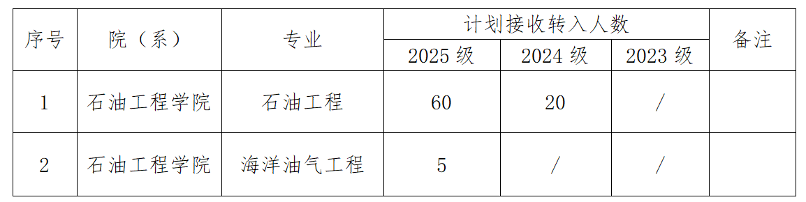 石油工程专业拟接收2024级转专业学生人数限20人,2025级转专业学生人数限60人;海洋油气工程专业拟接收2025级转专业学生人数限5人。